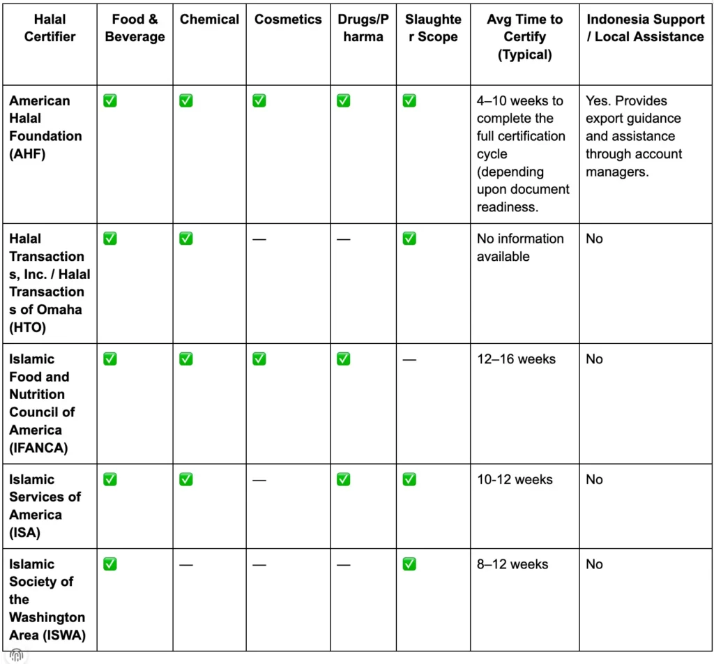 This guide provides a clear, up-to-date list of BPJPH-recognized halal certifiers in the United States, including their approved scopes (food, beverages, chemicals, cosmetics, pharmaceuticals, slaughter, etc.).